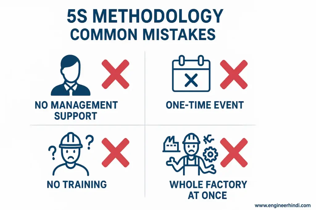 पहला step: Management commitment secure करें। Without management support, 5S fail होगा। Steps: