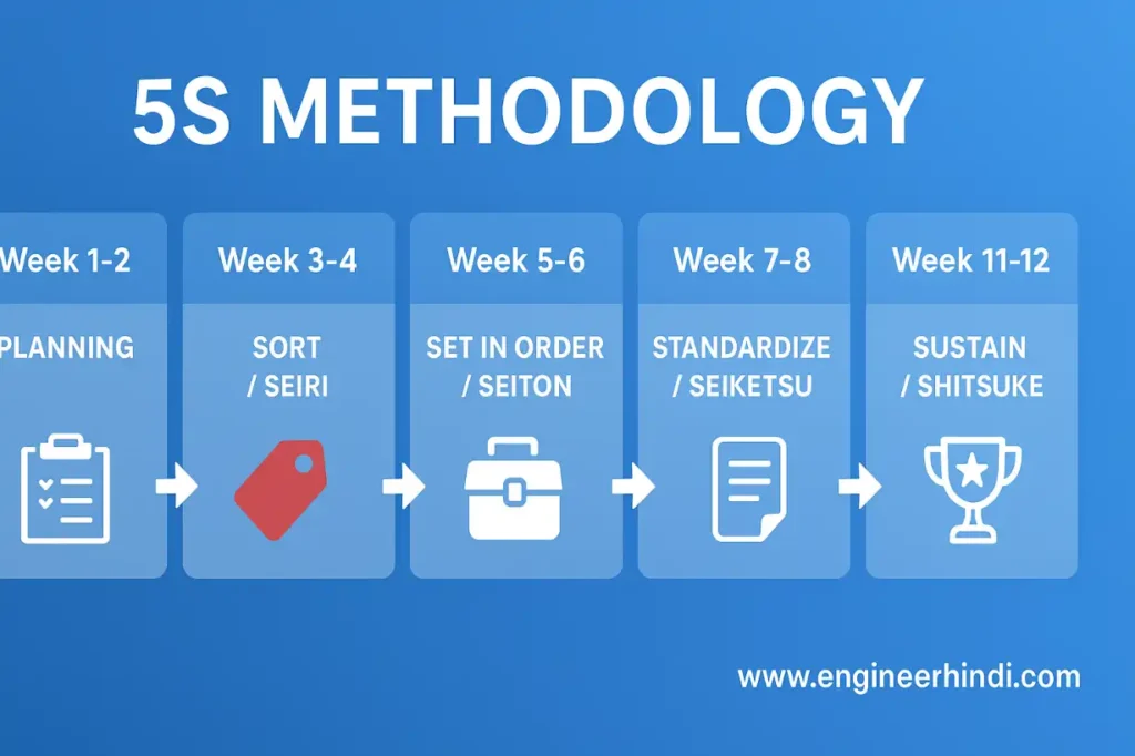 5S एक Japanese workplace organization methodology है जो workspace को organized, clean और efficient बनाती है।