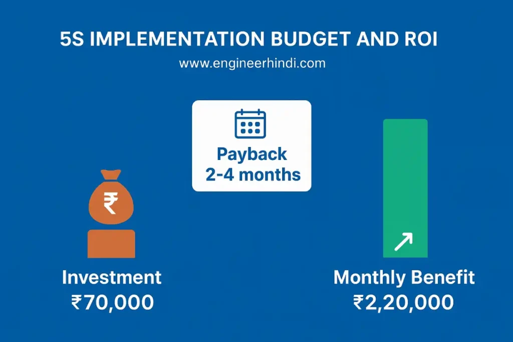 ROI period: 3-6 months। Expected monthly benefit: ₹2 lakh (small unit)। Investment mainly shadow boards, training, labeling, cleaning supplies में होता है।