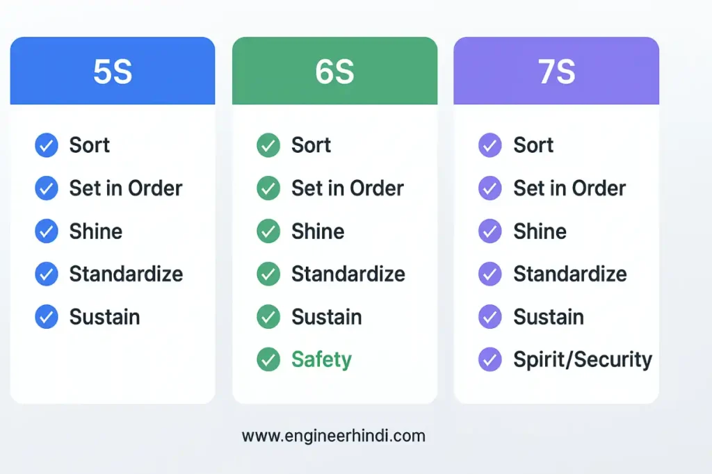 5S का मतलब: Sort (छटाई), Set in Order (सुव्यवस्थित), Shine (स्वच्छता), Standardize (मानकीकरण), Sustain (अनुशासन)। यह manufacturing, offices, warehouses सभी में use होता है।